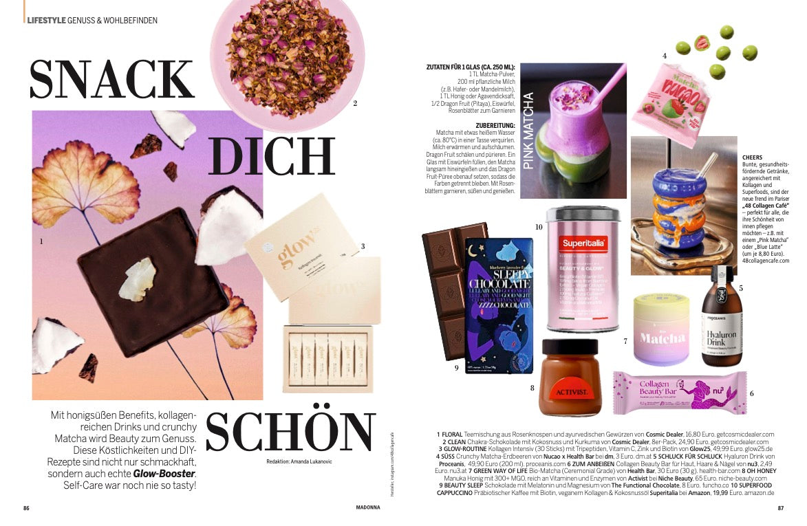 Le magazine autrichien Madone décrit notre Matcha et nos Fraises Matcha Croustillantes comme de véritables boosters d'éclat–et trouve que les deux sont également particulièrement savoureux.
