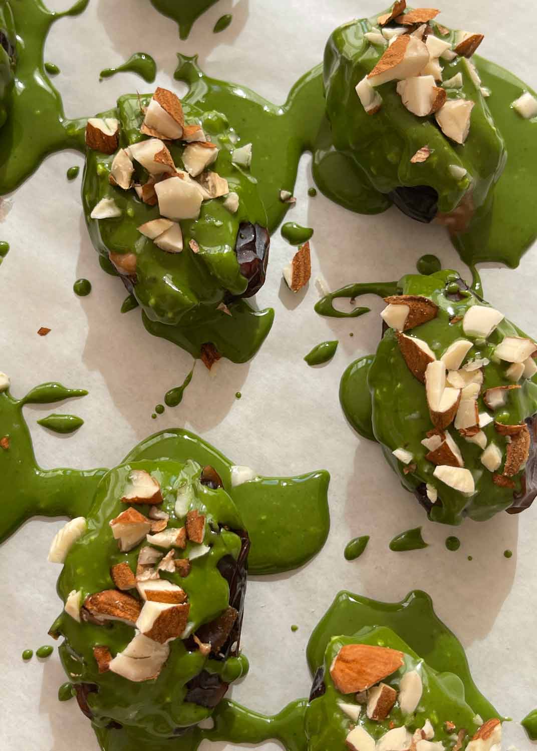 Morbidi, dolci e croccanti: questi datteri Medjool ripieni HEALTHBAR Matcha Chocolate e le mandorle croccanti sono uno spuntino fantastico da congelare. Fresche, cremose, con un tocco di verde! 💚