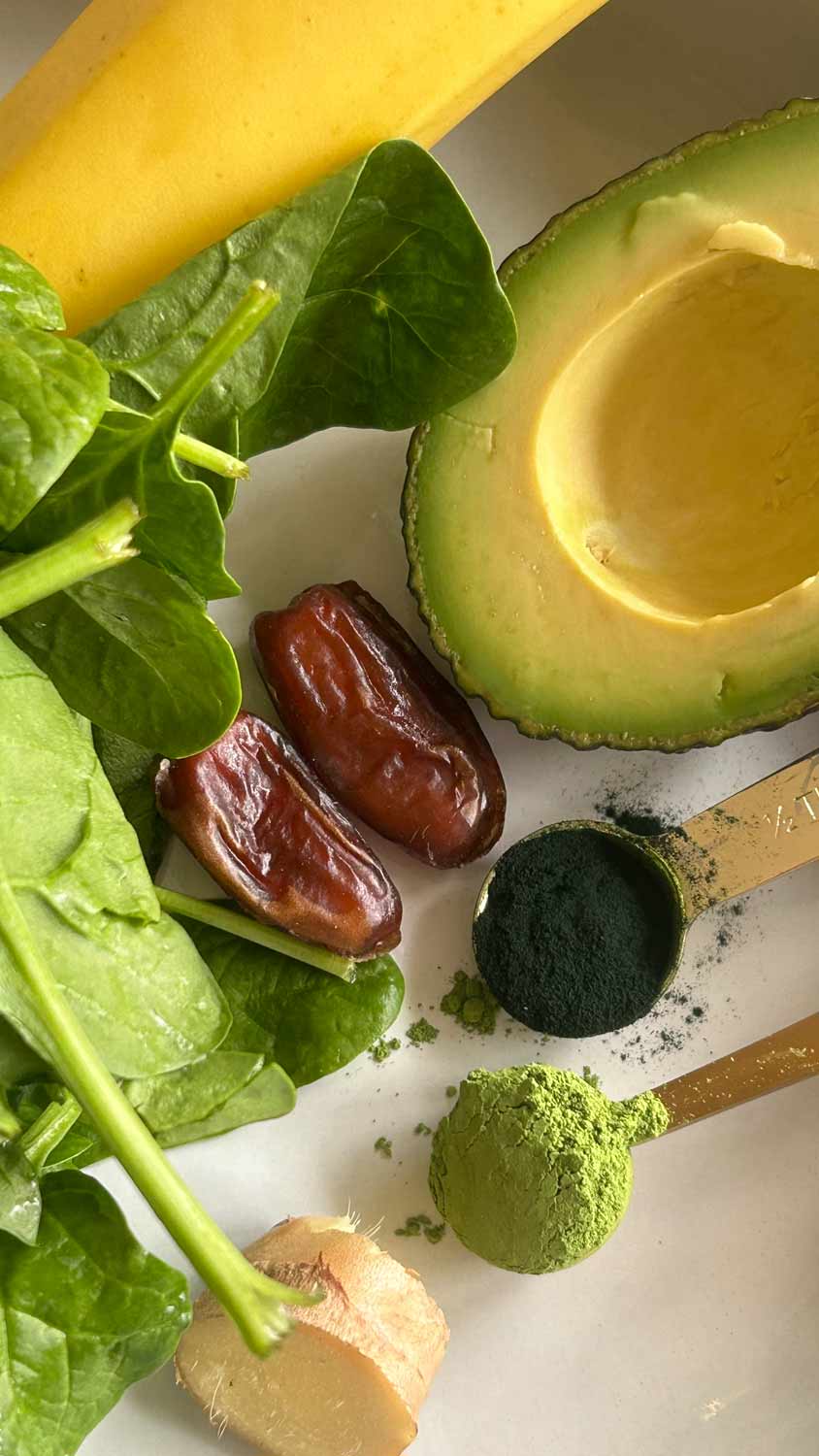 Banane schälen Avocado halbieren und entkernen. Spinat waschen Ingwer schälen und Datteln entsteinen falls nötig.