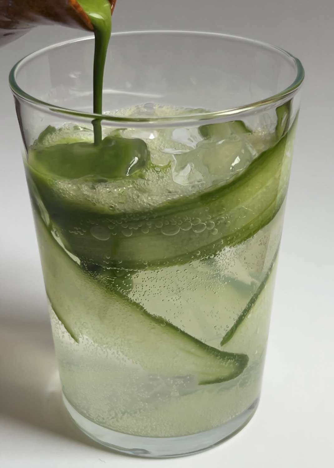 Komkommer-Kombucha ontmoet milde HEALTHBAR Ceremonial Matcha – een verfrissende zomerse drank met een licht sprankelende toets en een fijne balans tussen bitter en fris.