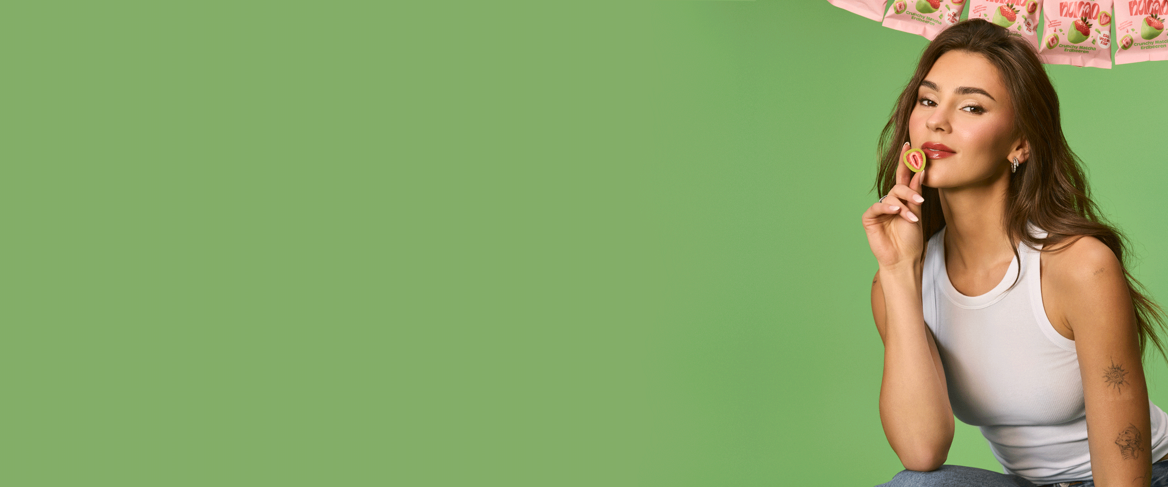 Gefriergetrocknete Erdbeeren, umhüllt von veganer Matcha-Schokolade – fruchtig, crunchy, cremig und voller natürlicher Power.